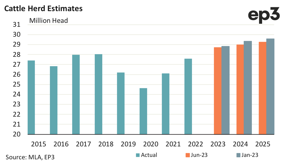 MLA have also revised the 2024 and 2025 herd projections downward by 1.3% and 1.2%, respectively. In 2024 the herd is expected to hit 28.9 million head and reach toward 29.2 million head in 2025.