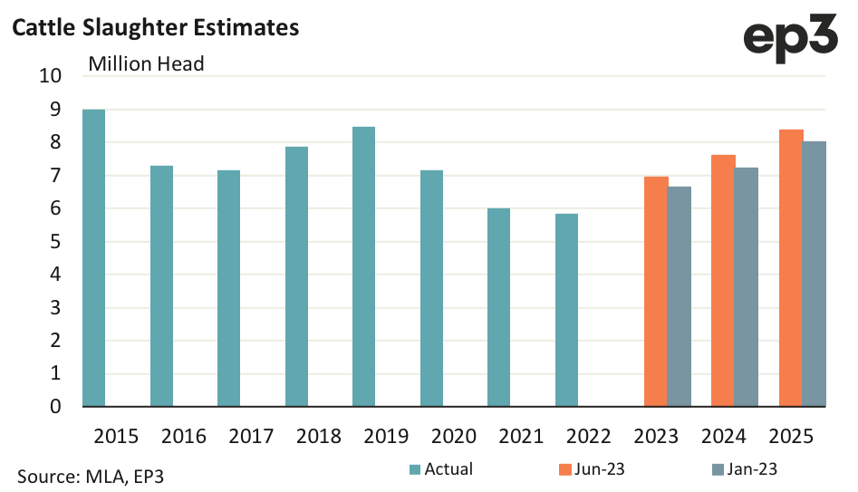 Underpinning the slower herd growth over the next few years has been upward revisions to annual cattle slaughter volumes. In 2023 MLA now project slaughter to hit 6.95 million head, an increase of 4.9% on the January 2023 estimates of 6.6 million head. Slaughter is forecast to grow further into 2024 too. MLA have revised the 2024 slaughter from 7.2 million head to 7.6 million head, a lift of 5.2%. In 2025 MLA now project annual slaughter to reach 8.35 million head, 4.4% higher than the 8 million head forecast in their industry update from January 2023.