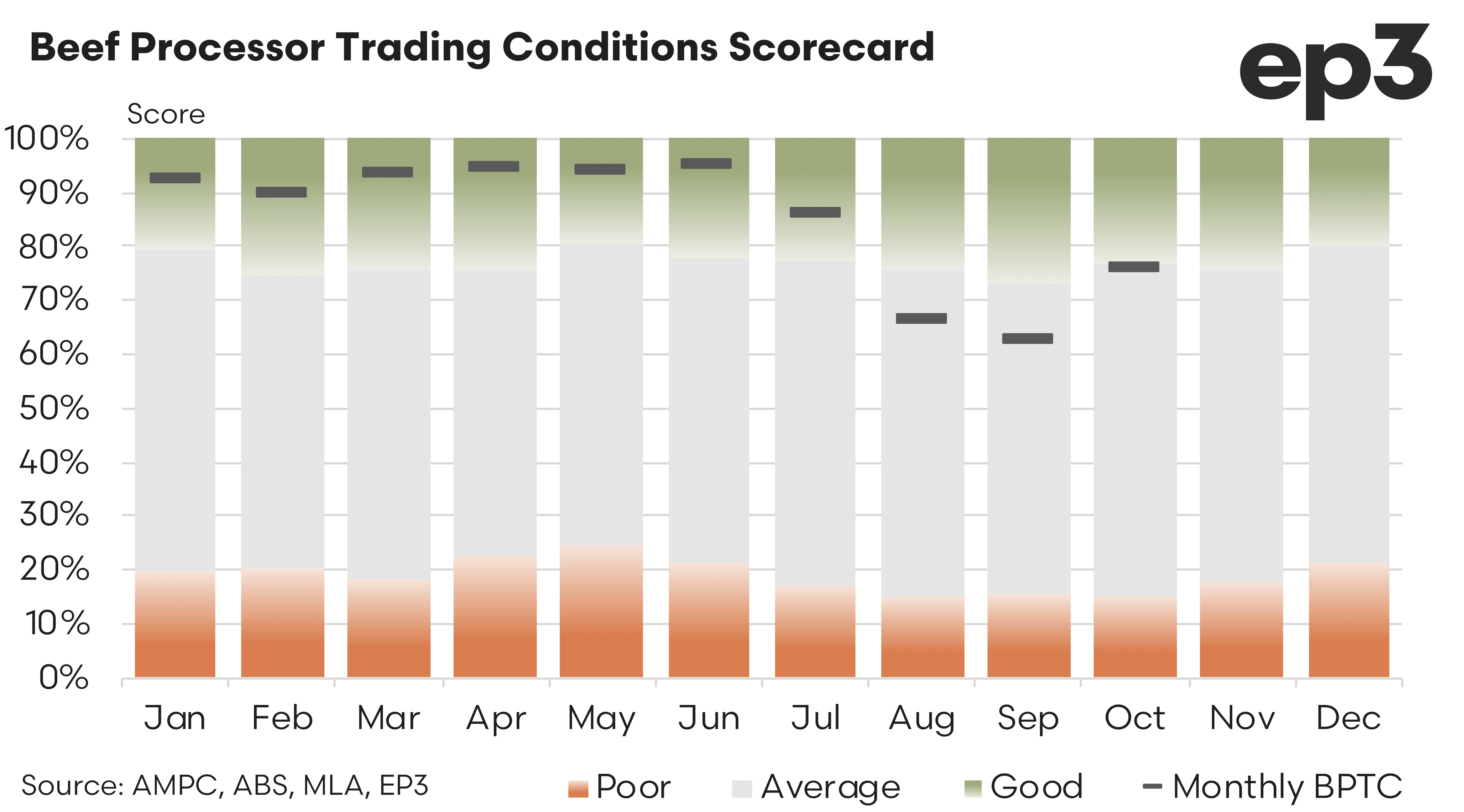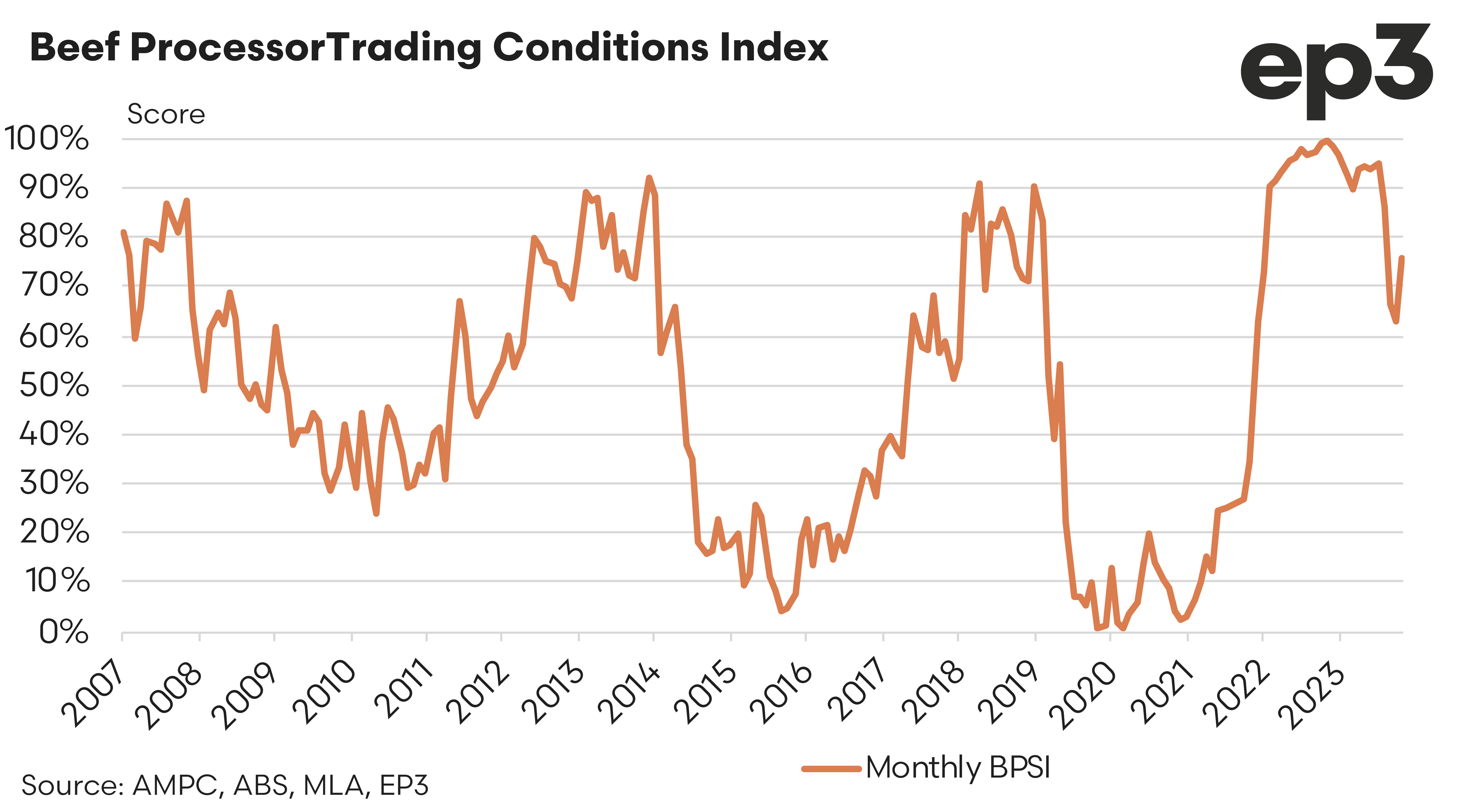 As a result, processors were able to see improved trading conditions and reduce some of the financial strain that had been building during the August/September period. After dipping to a ranking in the mid to low 60s through late winter/early spring the beef processor trading index score has lifted to 76% in October, reflecting that current trading conditions for the nation’s beef processors are better than 76% of the historic monthly records going back to 2007.