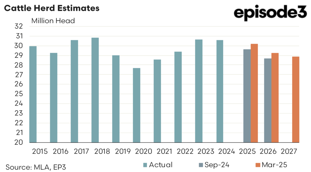 MLA’s latest outlook has revised the 2025 cattle herd estimate upward by 1.9%, bringing it to 30.1 million head, compared to 29.6 million head projected in September 2024. This suggests that the decline in herd numbers is progressing at a slower rate than initially expected.