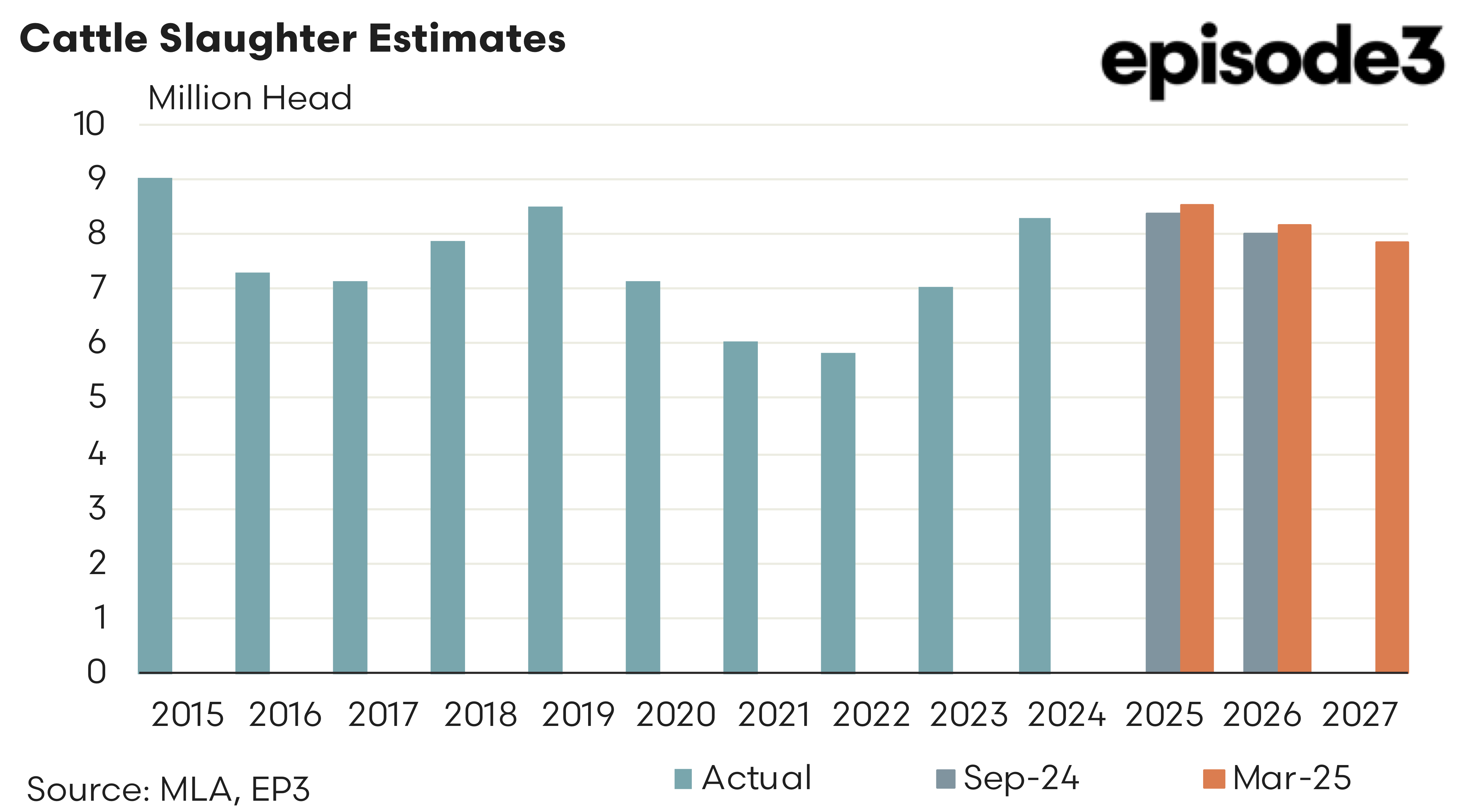 - 2025: Projected slaughter has been revised up 1.8% to 8.5 million head (from 8.4 million head previously).