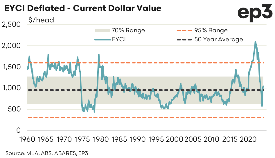 Meanwhile, the orange dotted lines demonstrate the boundary for extreme pricing, which in 2024 dollar values is either below $310 per head or above $1,600 per head for 300kg young cattle. Price movements beyond this range have occurred for just 5% of the time over the last 7 decades.