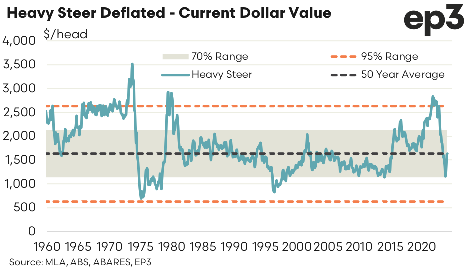 The “normal” price range for heavy steers is between $1,132 to $2,132 per head, as highlighted by the grey shaded region on the chart below. Meanwhile extreme pricing for a 550kg steer would be above $2,635 per head or below $630 per head, based on the last 7 decades of deflated price data.