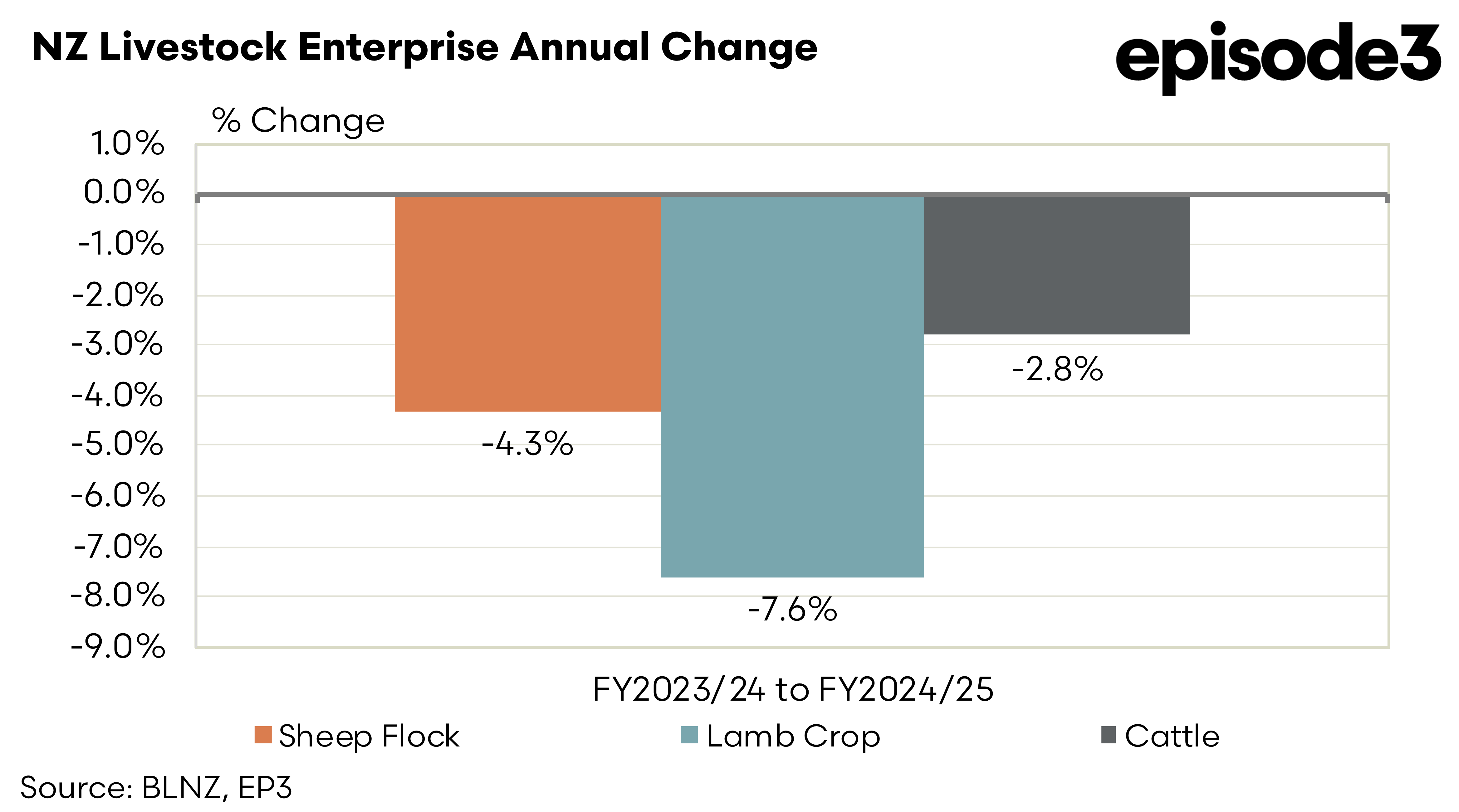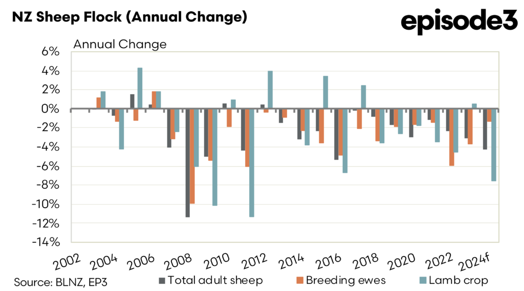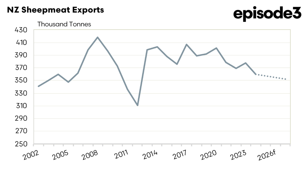 The most recent update to New Zealand’s sheep industry shows that it is now facing a continued decline, a reversal of their earlier forecasts reported upon by Episode 3 in March 2024. Recent projections indicate that the national sheep flock is continuing to shrink, with a 4.3% decline in total numbers expected for the 2024/25 season. This reduction is even more pronounced in the lamb crop, which is forecast to fall by 7.6%, representing a significant contraction in production capacity. These figures illustrate a broader structural shift away from sheep farming, driven by factors such as land-use changes, climate-related challenges, and economic pressures that favour alternative agricultural enterprises.