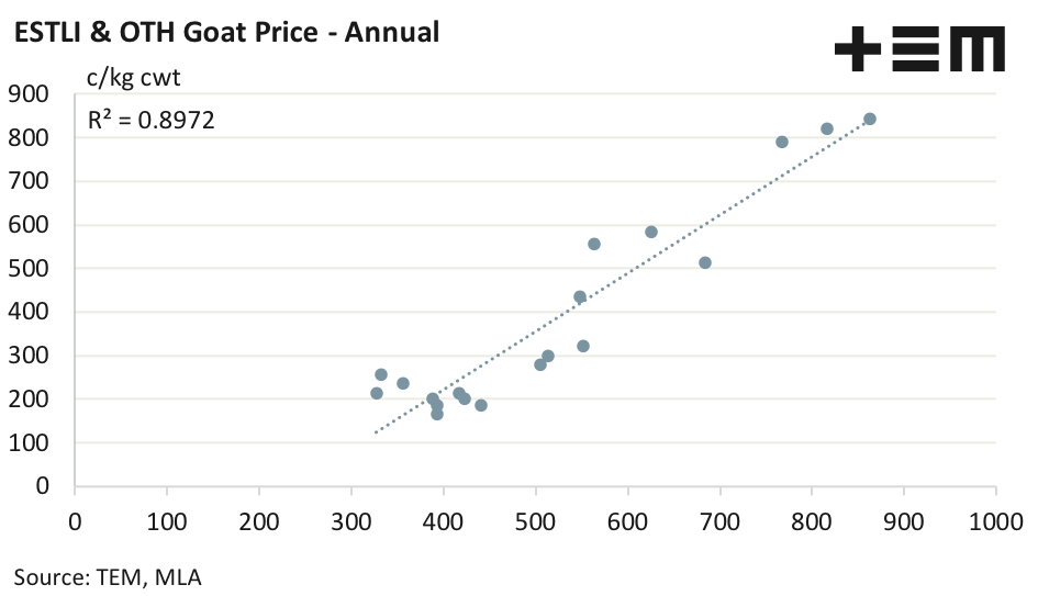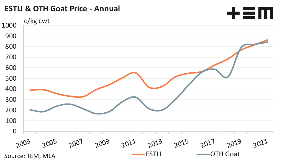 The 2021 OTH goat forecast was estimated to fall between 800-900c/kg cwt, depending upon the pace of the Covid-19 recovery. As it turned out the annual average OTH goat price for 2021 has come in around 842c/kg cwt (as at early December 2021), so our forecast range wasn’t too far off the actual outcome for the season. In the last five-years OTH goat prices have mirrored the ESTLI annual average and the broad trend in price movements have been fairly similar back to the early 2000s, so we have been using the strong relationship between OTH goat prices and the ESTLI fair value modelling outcomes to estimate the likely outcome for annual average OTH goat pricing.