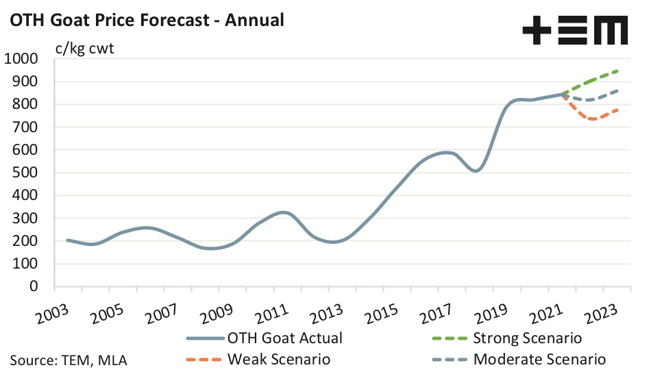We have provided three possible scenarios for goat pricing to 2023, taking a look at weak, moderate and strong potential pricing outcomes. For the 2022 season the modelling suggest that under a weak scenario OTH goat pricing is likely to average 736c/kg cwt. A moderate pricing scenario lifts the annual average forecast to 818 c/kg cwt, meanwhile a strong pricing environment will see it average 900 c/kg cwt.