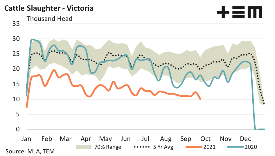 Weekly Victorian cattle slaughter figures eased by 18% to drop to the lowest volumes seen since the start of the season at just 10,054 head of cattle processed, for the week ending 24th September. This places the current cattle slaughter levels in Victoria at 49% below the five-year seasonal average for this time in the year.