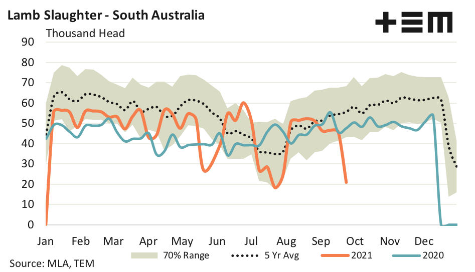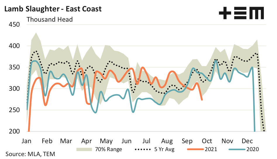 - Victorian lamb slaughter is currently running 14% under the levels demonstrated by the seasonal average and are in stark contrast to lamb slaughter in NSW, which is sitting 15% above the five-year trend