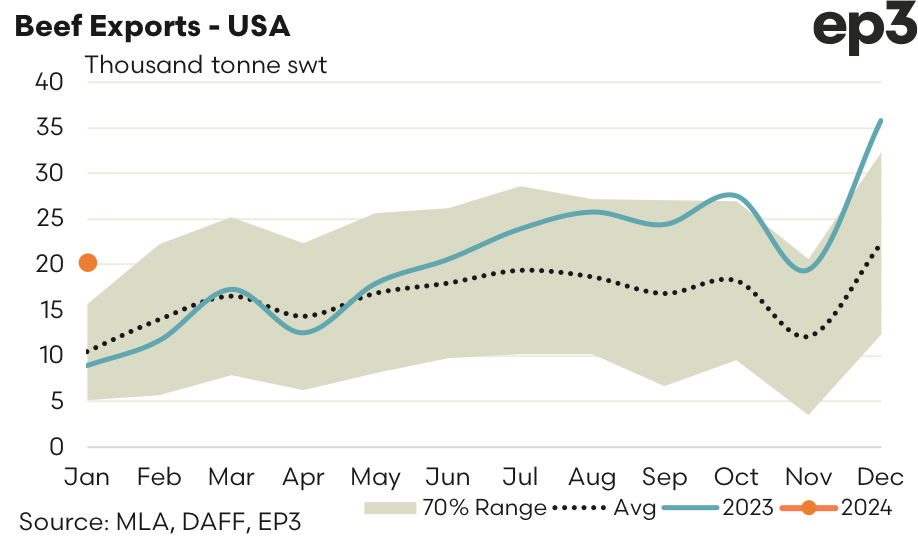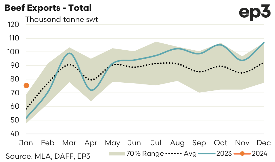 The 2024 season has opened in fine fashion for Aussie beef export flows with total beef export volumes at 75,585 tonnes swt. This represents the strongest opening to the year since 2020 and is nearly 30% above the average January export volumes based on the last five-years of trade. Compared to January 2023 the current export levels are nearly 47% higher with all four top trade destinations registering opening volumes above their respective five-year average levels for January.