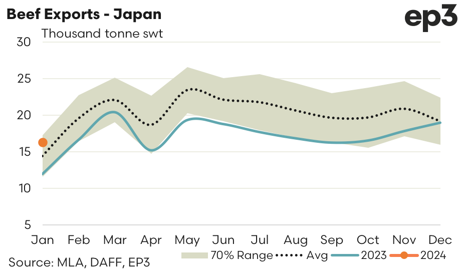 - Japan – After a promising end to 2023 the beef trade from Australia to Japan has opened the year in equally fine form. There was 16,331 tonnes of Aussie beef exported to Japan during January, which was the best opening result since January 2020 when 18,312 tonnes were reported shipped. The January 2024 result comes in 13% above the five-year January average volumes for Aussie beef exported to Japan and is nearly 37% better than the volumes sent during January 2023.