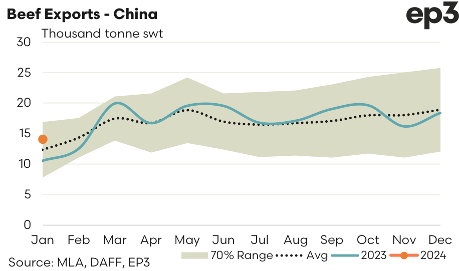 - China – Recorded 14,100 tonnes swt of Aussie beef shipped over January 2024, which is a 34% lift on the January 2023 flows and represents beef trade levels that are 14% higher than the five-year January average. This is the strongest start to the season for Aussie beef flows to China since 2020 when 21,026 tonnes were shipped.
