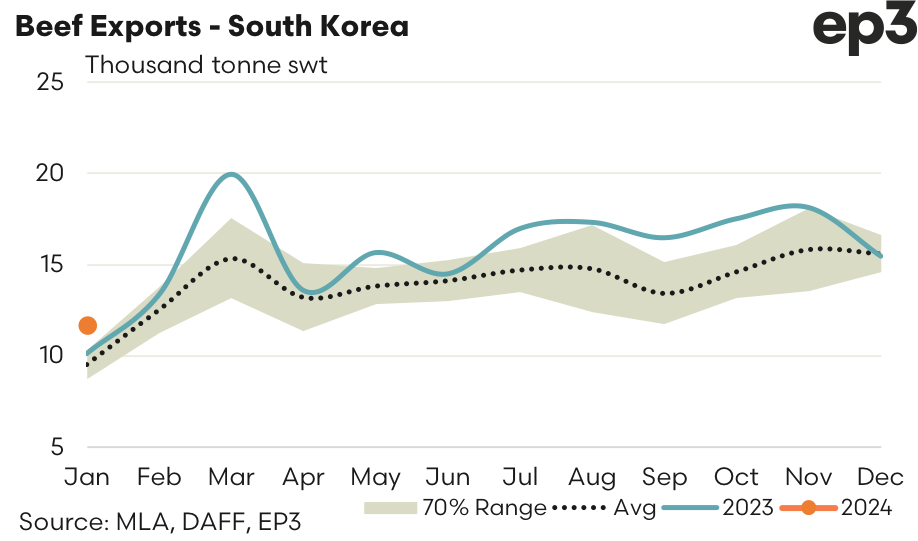 - South Korea – January 2023 saw the best opening for Aussie beef exports to South Korea since 2007, which was at the tail end of the BSE ban for US beef into South Korea and the only real option for beef exports into the country was from Australia. There was 11,682 tonnes reported shipped to South Korea from Australia during January 2024, nearly 23% higher than the average for January based on the last five years of trade and 15% better than the flows reported during January 2023.