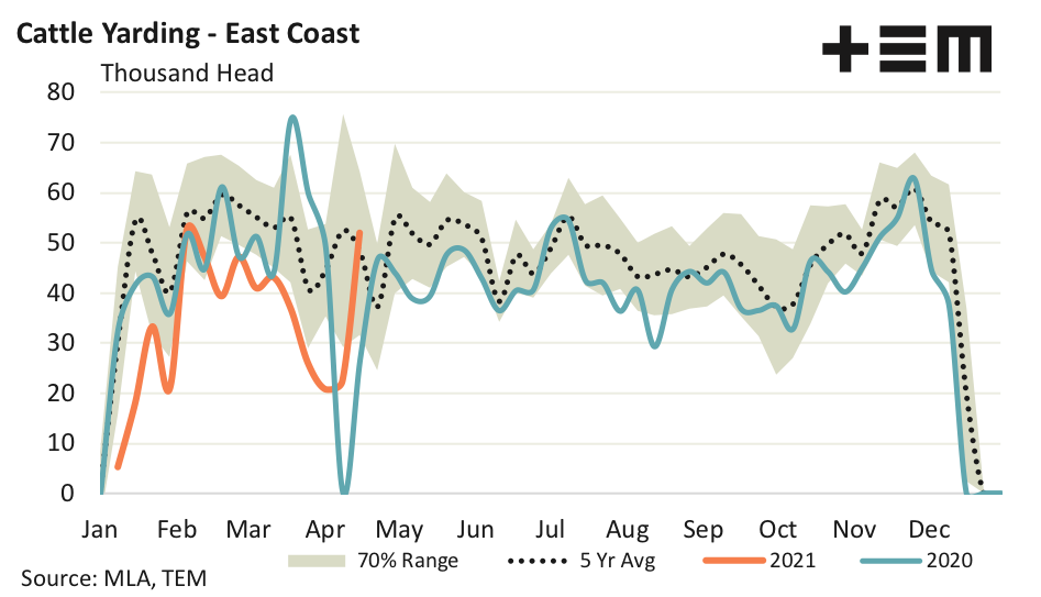 Weekly east coast throughput numbers have lifted strongly for cattle, sheep and lamb. East coast cattle yarding levels have risen 132% from the week prior to hit 51,490 head for the week ending on 16th April. Weekly cattle throughput now sits 7% above the five-year average pattern and while it is only in singles figures it is the first time this season that the weekly east coast cattle throughput has been above the seasonal average trend.