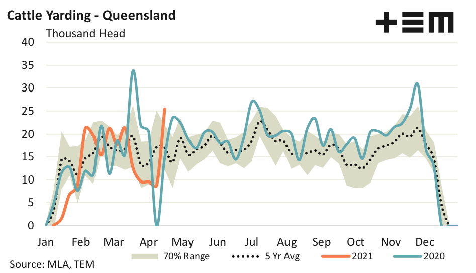 While all mainland east coast states contributed to the increased cattle throughput the biggest recovery on the week was seen in Queensland. Weekly cattle yarding levels in the “Sunshine State” jumped 188% to hit the highest weekly total seen this season at 25,474 head.