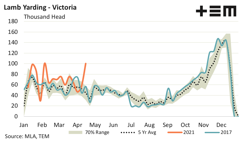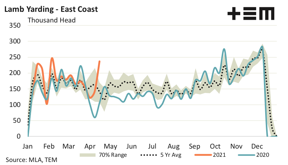 Weekly east coast lamb throughput has registered levels in excess of 200,000 head for the first time in ten weeks as sale yard lamb volumes surged by 66% on the previous weekly total. There were 236,602 head of lamb reported at east coast yards for the week ending the 16th April, representing lamb yarding levels that are 70% over the five-year average pattern for this time in the season.