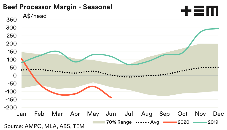 Indeed, the seasonal pattern highlights the margin slipping below zero in February and has remained there for the remainder of the 2020 season. June 2020 saw the lowest monthly margin to date at a loss per head of $137. While the annual average beef processor margin sits at a loss of $63 per head.