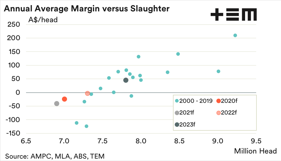 Analysis of the relationship between the annual average margin and annual average cattle slaughter in Australia shows that during tight supply seasons or during herd rebuild, when slaughter levels are low, processor margins tend to gravitate toward negative territory.