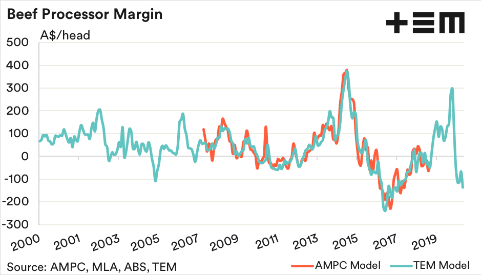 In late 2018 the Australian Meat Processor Corporation (AMPC) published an excellent report on theoretical beef processor margins which showed the average monthly margin per head received by a representative abattoir.