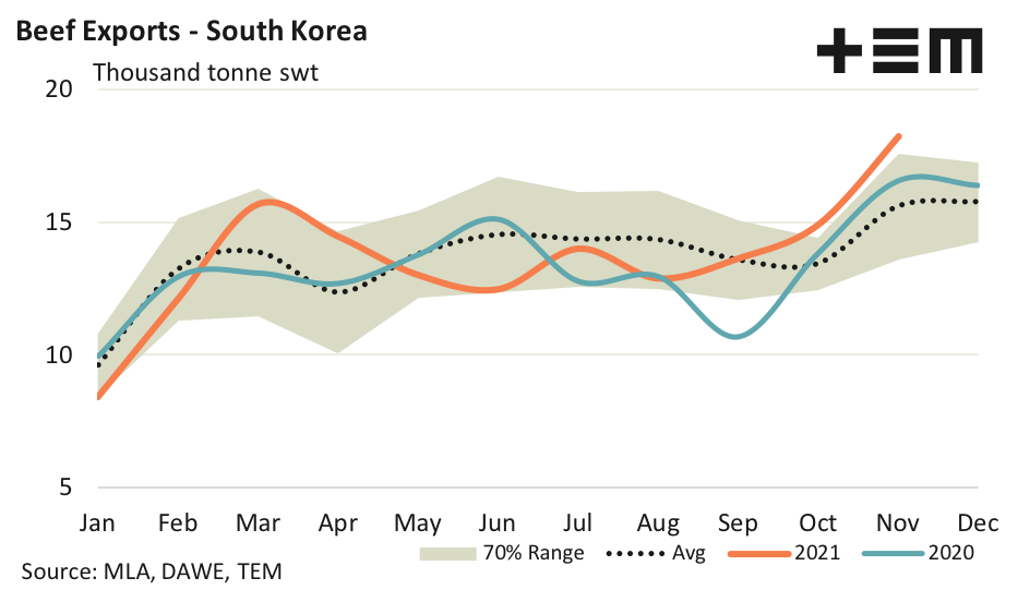 In a year when Australian beef exports remained relatively subdued, due to our high prices and low production volumes, we saw continued strength in demand for Australian beef from South Korea. Indeed, South Korea moved from the fourth highest beef export destination to the second highest during the 2021 season for Australian beef exports. The free trade agreement reached between South Korea and Australia will continue to benefit Australian beef producers as tariff levels will ease over the coming years and the safeguard threshold, which is the level of beef we can export annually to South Korea before we attract a tariff penalty, will continue to expand.