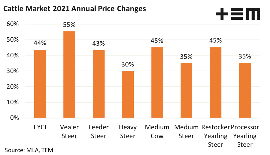 The National Heavy Steer was the laggard of the group. However, it still managed to register a 30% price lift over the year, finishing at 457c/kg lwt and over 100 cents higher than where it closed in 2020.