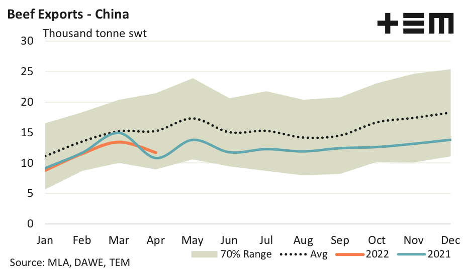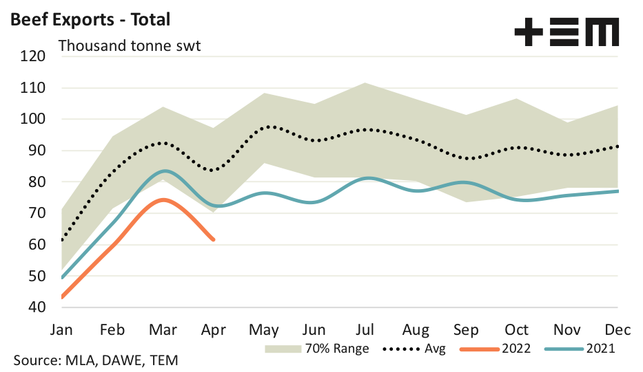 The pattern set by the five-year average trend shows that it is common to see total beef exports drop by around 9%. In 2021 the April decline in beef exports was a little milder at 13%. This April is the largest percentage drop in beef export volumes seen during the March to April period since 2017, when exports dropped by 26%.