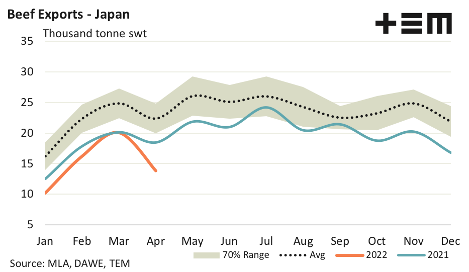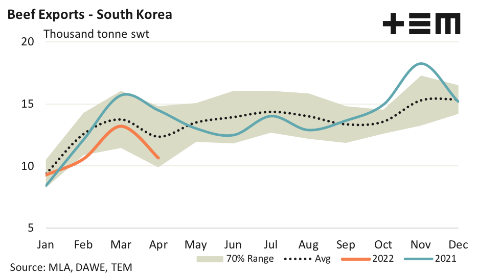 - Japan and South Korea saw the biggest declines in Australian beef exports over April of 31% and 19%, respectively.