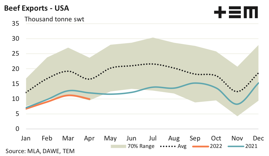 China and the USA demonstrated more moderate declines in Australian beef export levels over April at 13% and 11%, respectively. Indeed, the Chinese trade in April 2022 was about 8% higher than the April 2021 levels, coming in at 11,730 tonnes versus the 10,820 seen last season. Presently, since the start of 2022, beef exports from Australia to China are running at level about 17.5% under the five-year average trend. The USA saw just 9,929 tonnes of beef from Australia during April, which represents levels that are 40% under the average for April.