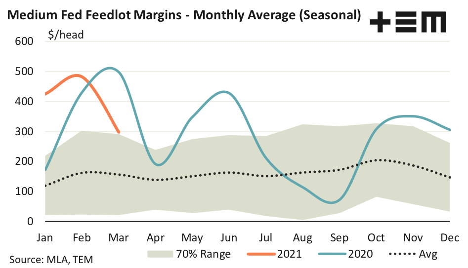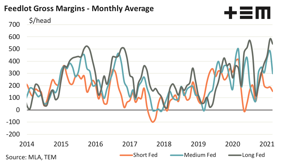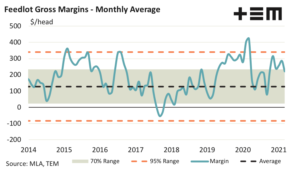 - The weighted average feedlot gross margin has eased 30% since late 2020 to sit at a monthly level of $220 per head for March 2021.