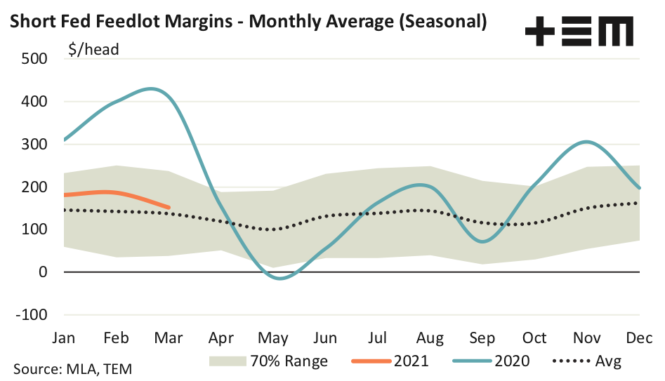 The weighted average feedlot gross margin (which includes short, medium and long term feed regimes) has eased 30% since late 2020 to sit at a monthly level of $220 per head for March 2021. Despite the softening trend, the gross margin is still holding at the upper end of the normal range and around $90 a head higher than the long term average of $130 per head.