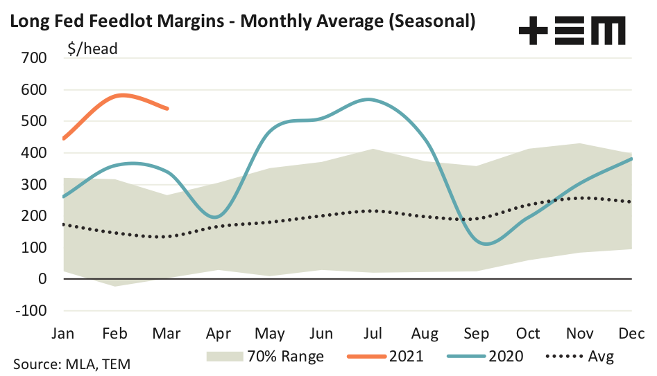 The long fed rotation gross margin improved by 30% during January to February, but then has eased 7% during March to sit at $541 per head. As the seasonal pattern highlights the long fed regime is running well above the levels that would normally be expected for this time in the season.