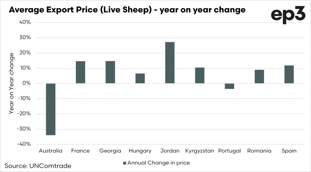 To delve further, we can look at each country’s average export price for sheep. This is a crude calculation, but it indicates the average price of a sheep loaded onto a boat.