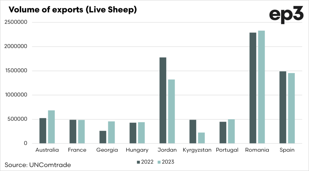 The countries dominating live exports are Jordan, Romania and Spain. It is important to remember that many exports in countries like Romania and Spain are exported overland (via truck) within Europe.