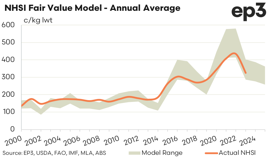* – Bear in mind that any changes to current model inputs will impact the fair value ranges and annual average predictions supplied in this article. The EP3 NHSI model aims to predict the fair value level of the NHSI based on a selection of demand and supply factors that have historically exerted an influence on the NHSI. There is no guarantee that this model will continue to be accurate into the future and any individuals considering this model and it’s output in their decision to buy/sell cattle should exercise caution, consider their own individual circumstances and seek advice specific to their personal situation.
