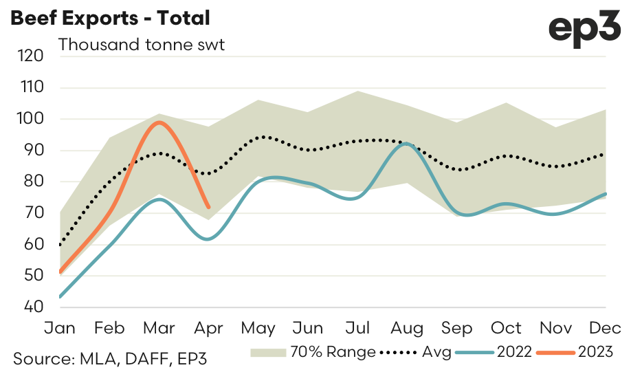 Total Aussie beef exports have declined by 27% during April to see 72,063 tonnes swt sent offshore. Although, it is not uncommon to see beef exports ease over April (the average trend shows a 7% decline from March to April over the last five-years) the strength of the turnaround has seen flows move from the upper end of the “normal” range to the lower end of the “normal” range in just a month.