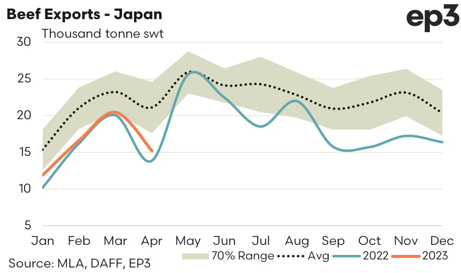 - Japan – April beef exports from Australia dropped 26% from the levels seen in March to register 15,225 tonnes swt. The export pattern for 2023 continues to closely mirror the pattern set in 2022 with this April’s beef trade volumes sitting 28% under the five-year average for April.
