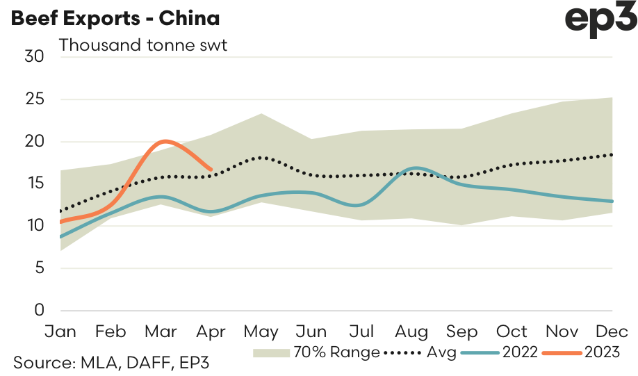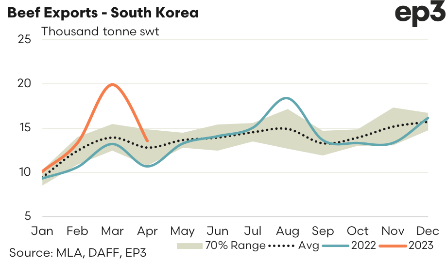 - South Korea – beef exports from Australia eased 32% over April to 13,586 tonnes. Despite the strong fall South Korean flows also remain above the five-year average for April by 6%.