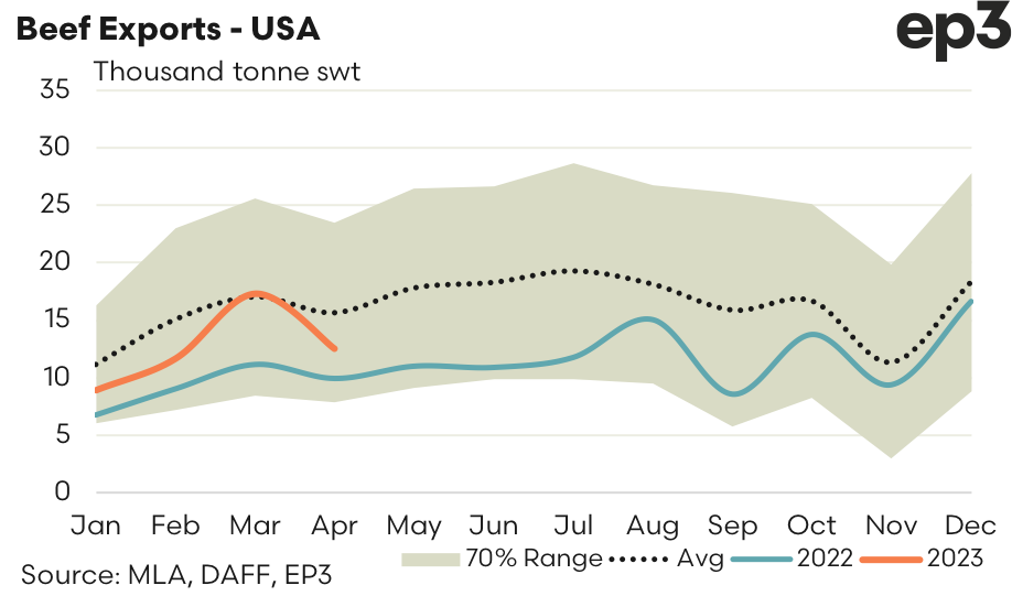 - USA – saw a 27% drop in beef exports from Australia over April to see 12,547 tonnes shipped. Compared to the five-year seasonal pattern for April, current flows are running 20% under trend.