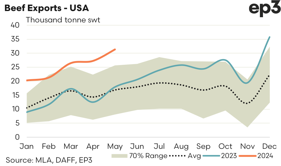 USA – During May 2024 there was 31,294 tonnes of beef shipped from Australia to the USA, the best monthly flows since December 2023. May saw a 15% lift in Aussie beef exports over the month and the current volumes being sent to the USA are sitting 85% above the average seasonal trend for May, based on the last five-years of the trade.