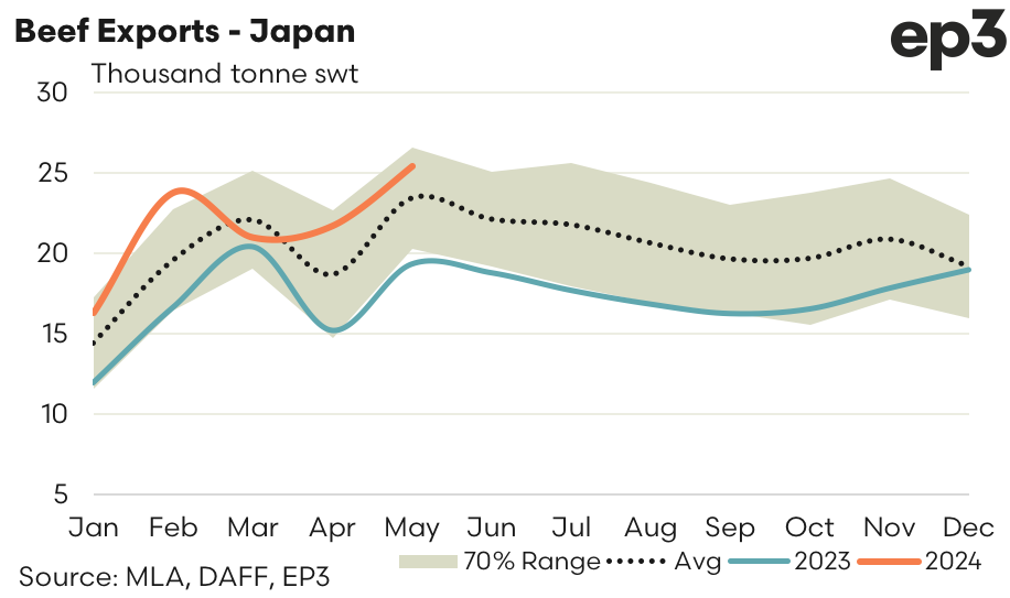 Japan – There has been a noticeable increase in demand for Aussie beef from Japan in 2024 and May 2024 has been no exception. There was a 17% lift in beef exports from Australia during May to see 25,435 tonnes consigned. Current flows to Japan represent trade levels that are nearly 9% above the five-year seasonal average for May.