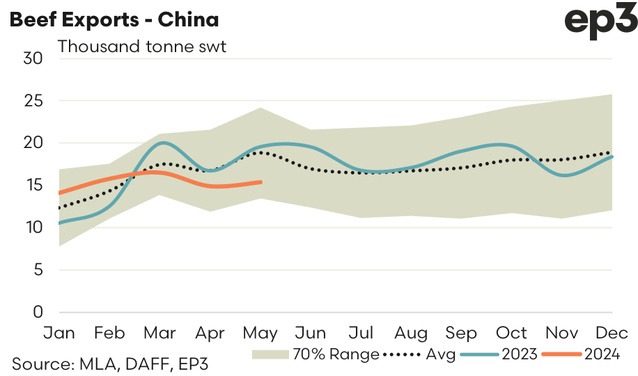 China – As already outlined, the Australian beef trade to China has been running at levels below the average trend and this has continued during May 2024. There was 15,359 tonnes of Aussie beef shipped to China in May, which was a marginal 3% increase from the flows seen during April 2023. Compared to the five-year seasonal trend the beef trade from Australia to China is currently running nearly 19% below the May average levels.