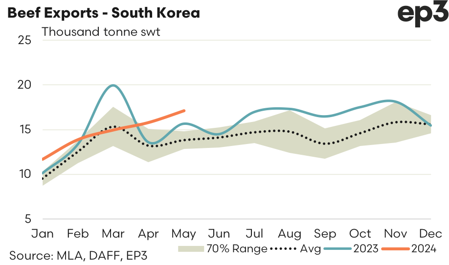 South Korea – May 2024 saw an 8% increase in beef from Australia from the flows reported in April to register 17,096 tonnes swt shipped for the month. A comparison of current flows to the five-year average for May shows that Aussie beef demand in South Korea is running nearly 24% above trend.