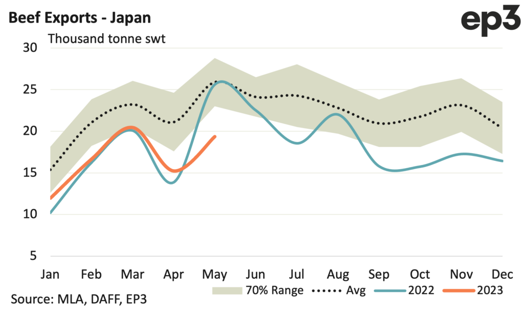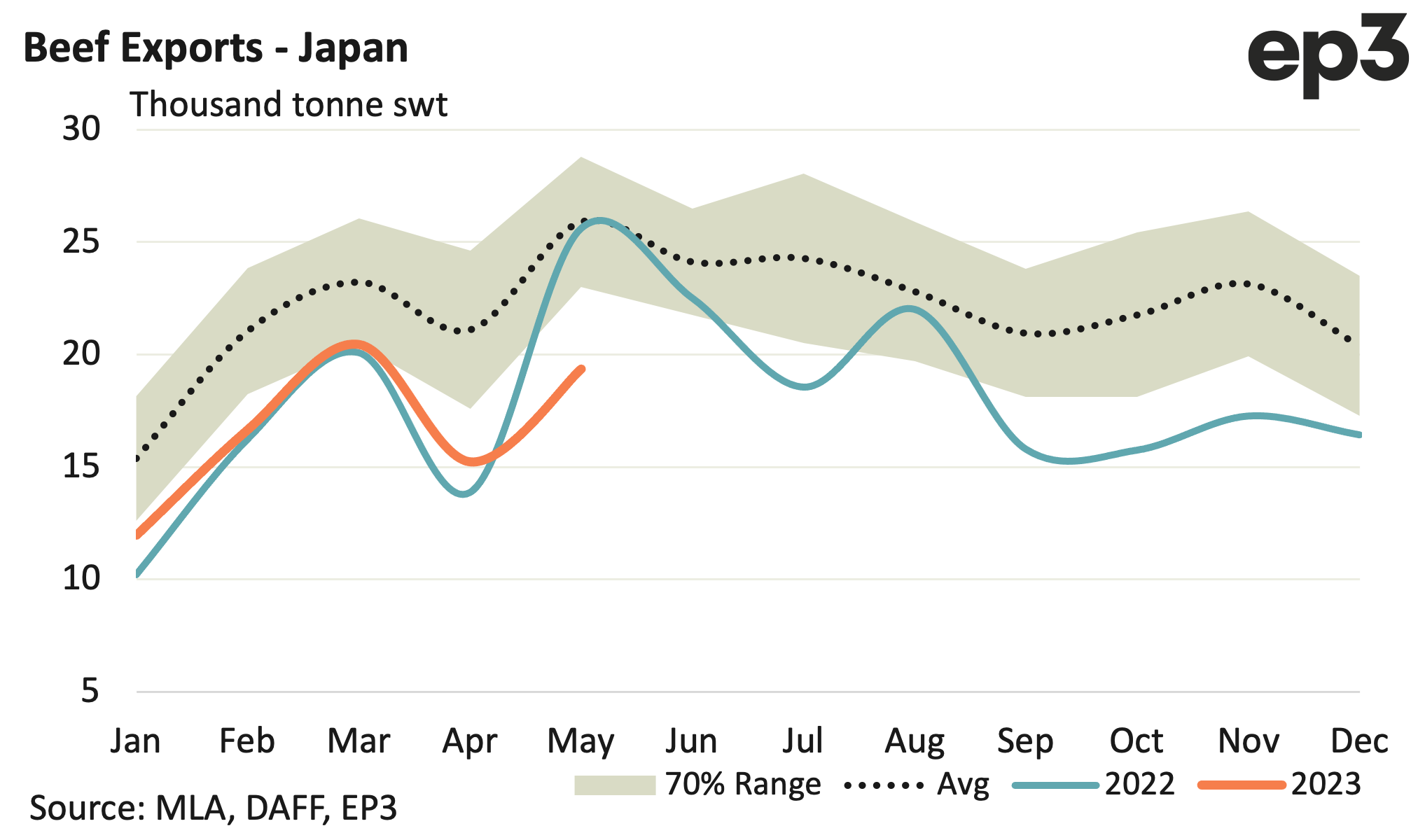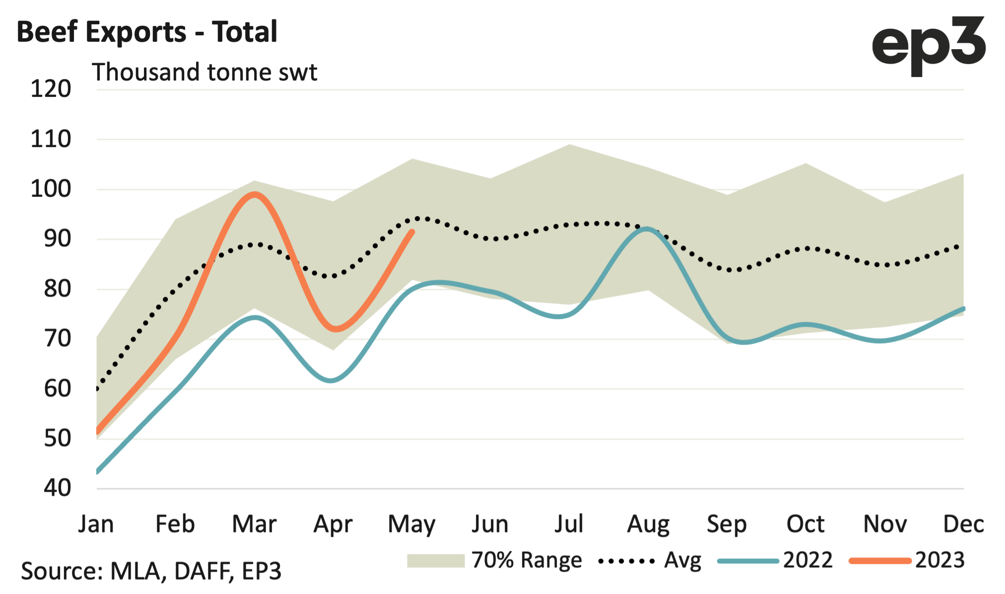 There was 91,479 tonnes of beef shipped from Australia over May 2023, which is just 3% below the average levels for May according to the pattern set over the last five years.