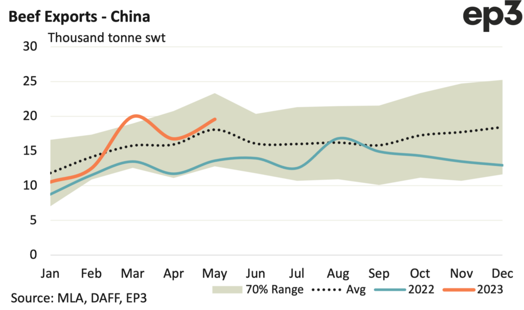 - China – More Aussie beef was sent to China than Japan over May with 19,569 tonnes recorded, representing an increase of 17% on levels exported in April. Chinese demand for Australian beef export remains above the average pattern by around 8%.