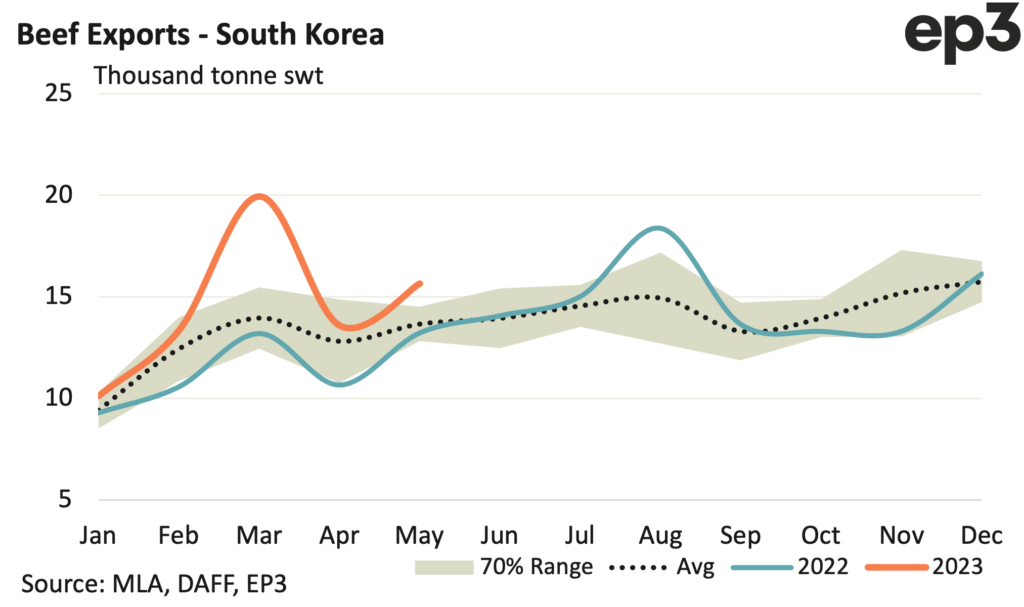 - South Korea – Beef exports from Australia to South Korea have stayed above the five-year average trend all year so far and May has not been an exception with flows sitting nearly 15% above the seasonal trend. There was 15,648 tonnes exported during May, which was a 15% gain on the volumes traded in April.