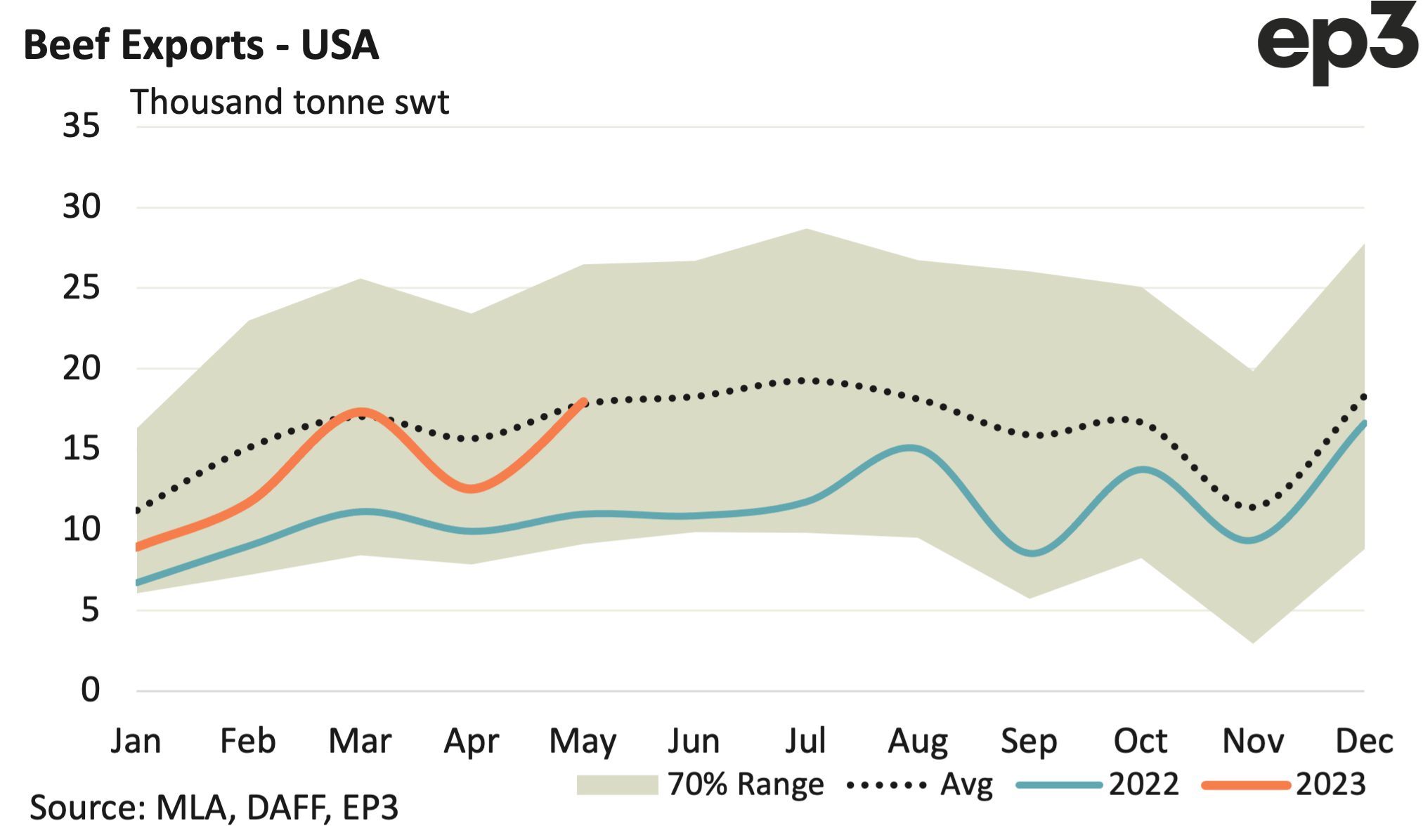- USA – The American market for Aussie beef exports has improved considerably this year, assisted by red hot US cattle prices and much more competitive Australian prices, leading to some strong discounts in the spread between finished cattle in Australia versus the USA. There was 43% increase in beef export volumes from Australia to the USA over May to see 17,940 tonnes shipped last month, which is pretty much in line with the five-year average for May.