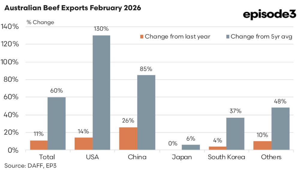 The February data reinforces the broader theme currently shaping Australian beef exports. Demand across several major markets remains extremely robust while Australia continues to move through a period of elevated cattle supply. For now the numbers point to a simple conclusion. Australian beef exports remain historically strong for this point in the year, and unless global demand conditions shift materially, export volumes are likely to remain elevated through much of 2026.