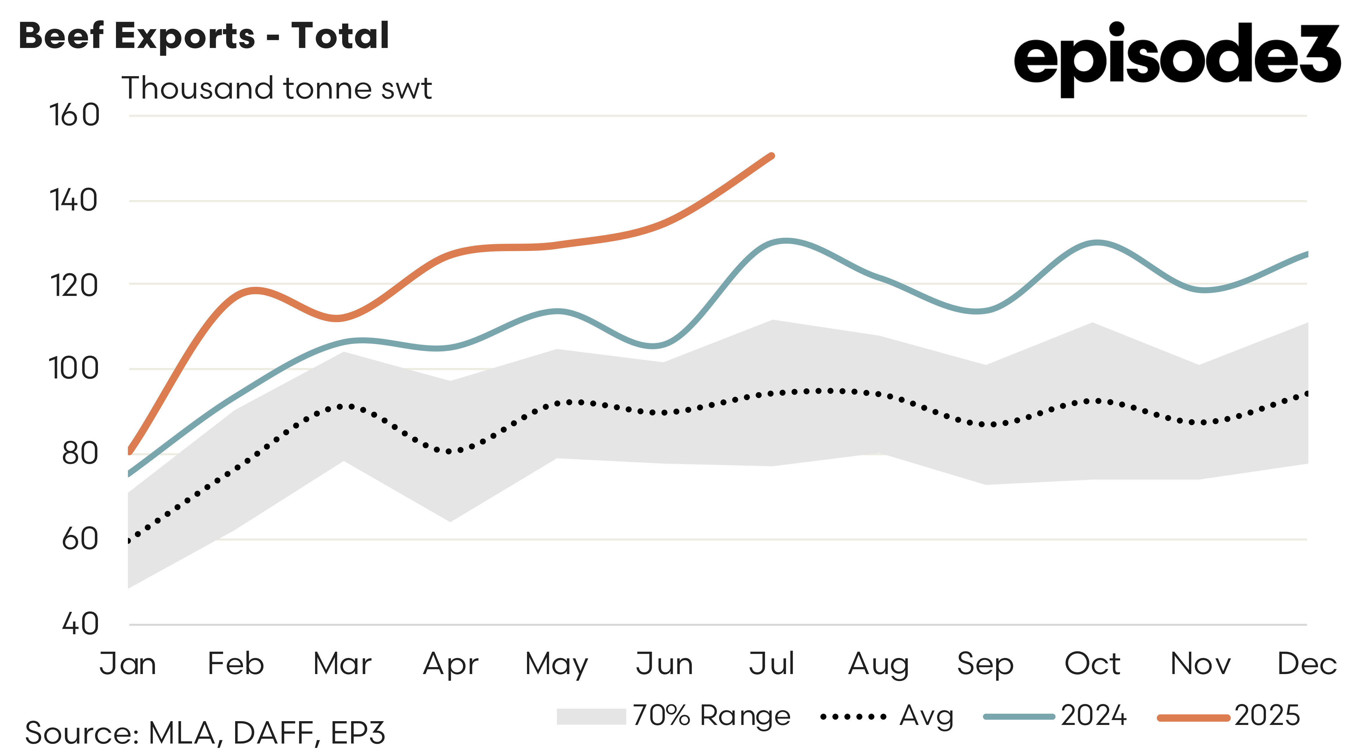 Australian beef export volumes reached a new historic peak in July 2025, with a total of 150,435 tonnes shipped offshore. This was up 12% from the previous record set in June at 134,593 tonnes. The result is also well above the five-year average for July by nearly 60%, underlining the exceptional strength in export demand.