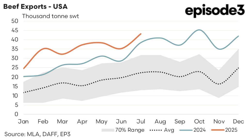 USA – Remains the largest export market for Australian beef in 2025. July volumes increased by 22% to 43,038 tonnes, and year-to-date exports are around 246,000 tonnes, up approximately 27% on the same period in 2024. Strong demand is being fuelled by US domestic cattle herd numbers at 70-year lows and reduced competition from Brazil due to tariff restrictions. Compared to the five-year average for July the beef trade flows to the USA are 93% stronger this year.