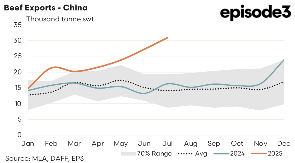 China – There has been a steady increased in Aussie beef to China with July increasing a further 13% on the back of the 14% lift seen in June and the 11% gain seen in May. July saw 30,925 tonnes shipped which represents trade levels that are 120% above the normal July average flows based upon the last five years of the trade, with year-to-date volumes at around 160,000 tonnes, up about 51% from 2024. Demand remains solid across both grain-fed and grass-fed categories.