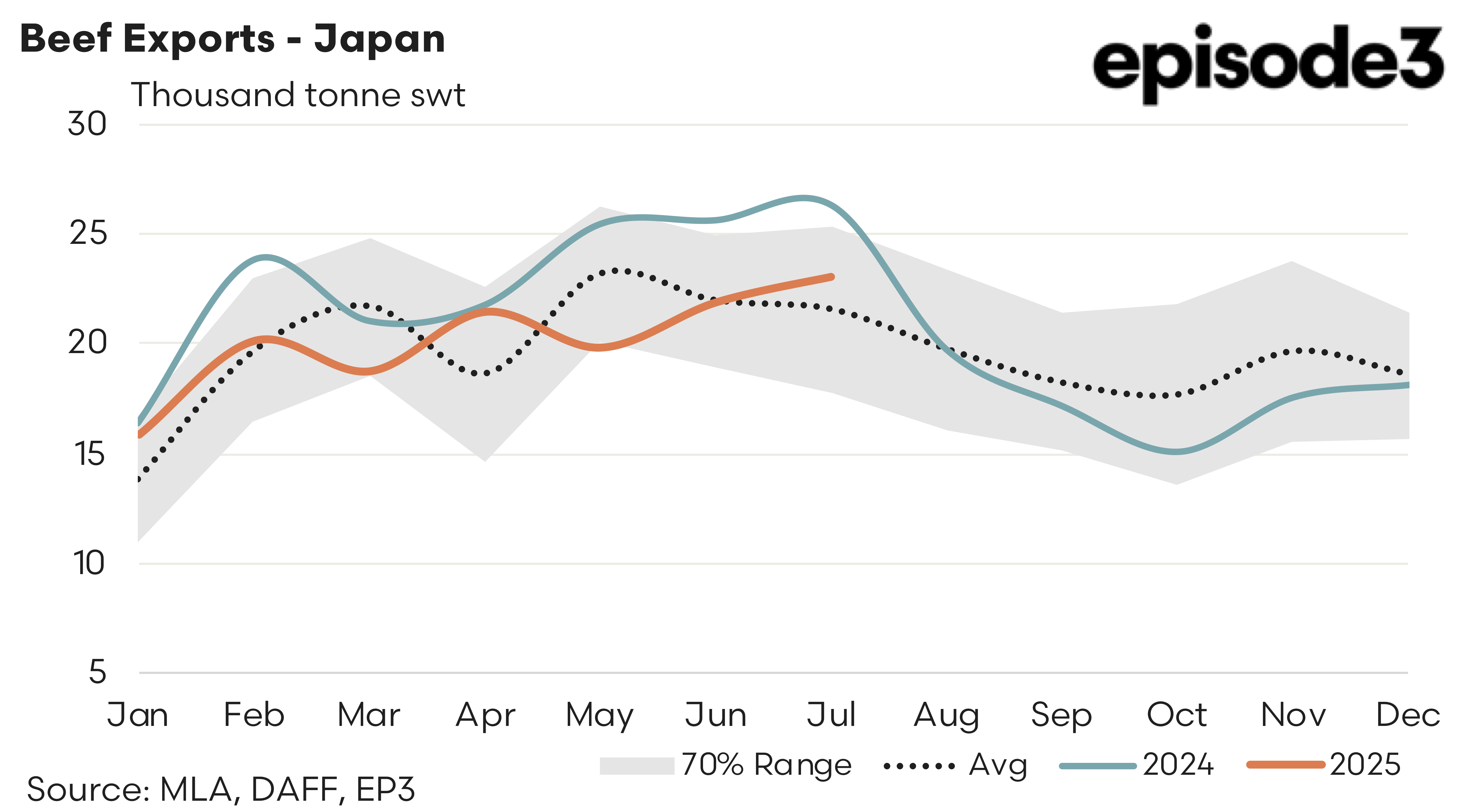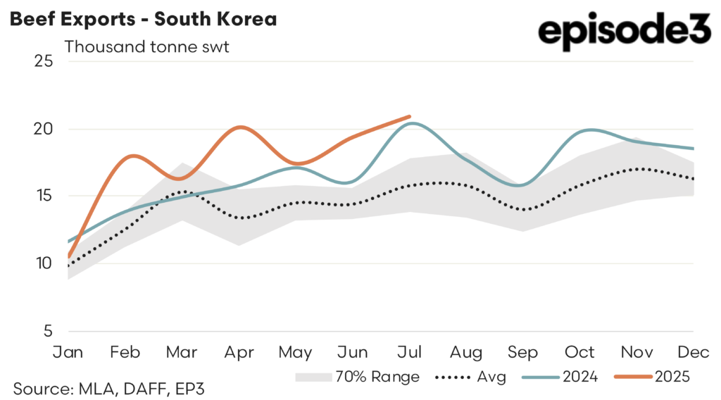 Japan – A reasonably consistent high-value market for Australian beef, with year-to-date shipments sitting near 140,000 tonnes. Monthly volumes this year have typically tracked in the low-20,000-tonne range, supported by steady retail and foodservice demand. July flows came in 5% stronger than June at 23,056 tonnes, representing trade levels 7% higher than the five-year average trend for July.